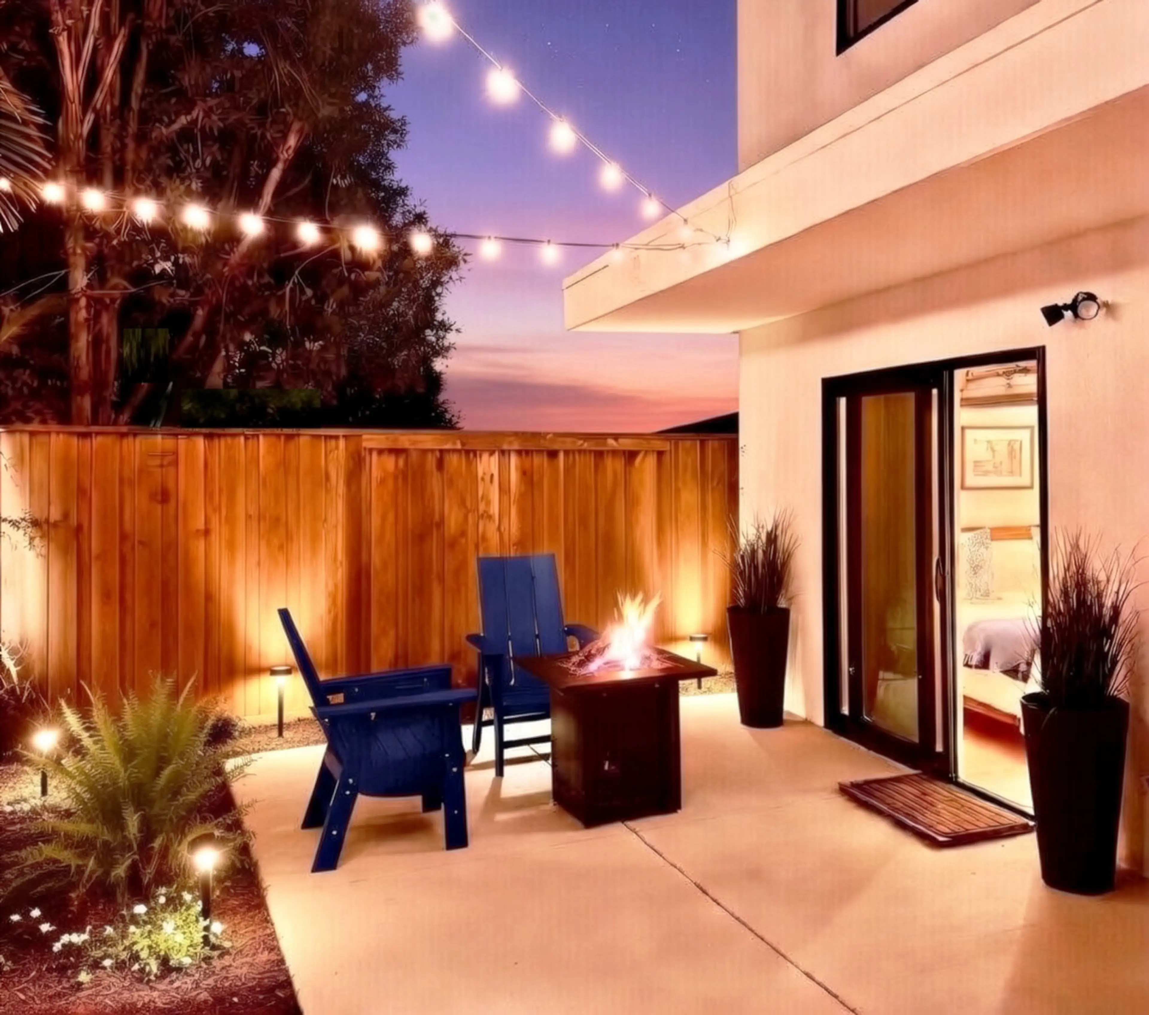 Surf Casita — Ground-level retreat with private fire pit patio, cinema TV, and beach gear included. Sleeps 5.